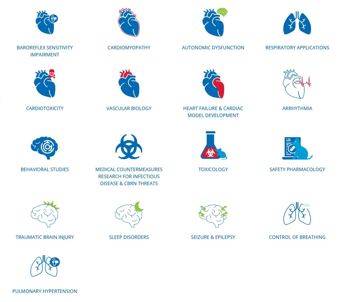 This page lists techniques and measurements employed by the easyTEL+ system for rodents, and used in the area of measuring cardiovascular, neurological and respiratory outcomes.