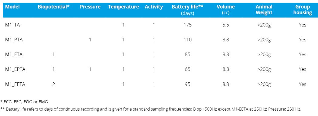 easyTEL+ is a fully implantable digital system, that transmits physiological data from conscious freely moving laboratory animals. Intended for use in preclinical research (primarily toxicology, pharmacology and safety pharmacology studies) and biodefense, the easyTEL+ implants are ideal for rodents > 200g such as rats. Various models offer the ability to continuously record Biopotential (ECG*, EEG*, EMG*, EOG*), Blood pressure (Arterial and/or Left Ventricular Pressure), Respiratory rate**, Temperature and Acceleration.
