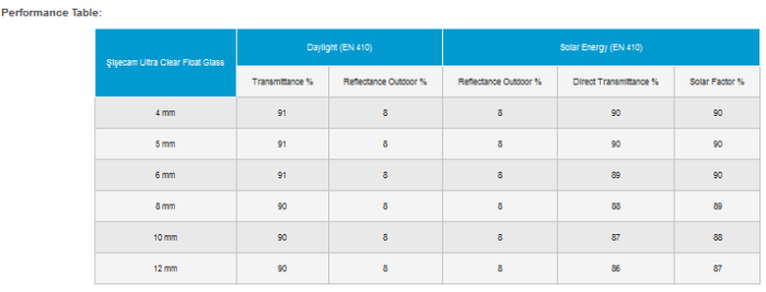 - Şişecam Ultra Clear Float Glass has 91% light transmission.