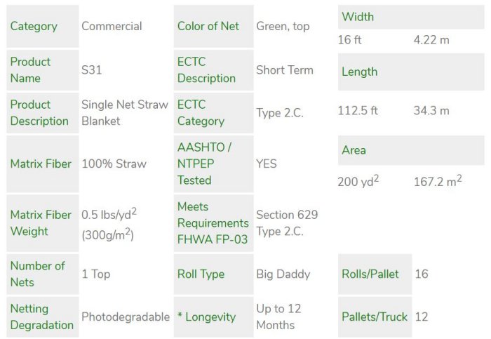 16 foot wide 200 square yards per roll. This single sided straw blanket is great for the large slopes where you have to carry the rolls to the slope. Less overlap makes this a very efficient product.