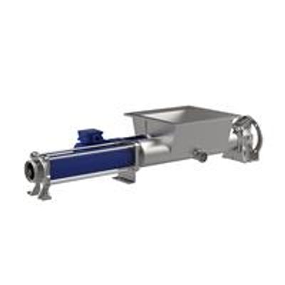 Model with pre-feed hopper, auger screw and blade bridgebreaker for dense products, blocks or pieces which tend to form a bridge over the auger screw. The blade bridge-breaker with separate gearmotor breaks up the product to be pumped, dislodging any clogs which might develop, taking the product towards the pre-feed screw. As with the "MC" series, these pumps are available with a closure cover.