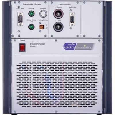 The ECi Booster, designed by Nordic Electrochemistry, is a current amplifier capable of enhancing the current output from a potentiostat or galvanostat like the ECi-200. This booster effectively increases the current delivery up to 30A by amplifying the analogue signals received from the potentiostat. It operates seamlessly with EC4™DAQ Software, ensuring efficient control and data acquisition during electrochemical experiments. A notable feature of the ECi-Booster is its integration of safety mechanisms that allow external sensors to monitor critical conditions such as excess temperature or gas production. In response, the safety sensor can signal the booster to halt current delivery, thereby protecting the experimental setup and operator. This functionality makes the ECi Booster an essential tool in advanced electrochemical research, offering enhanced control and safety.