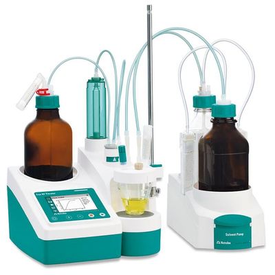 The new Eco KF Titrator with integrated magnetic stirrer and touch-sensitive display is ideal for routine water content determination. Predefined methods enable a smooth and easy instrument start-up. In addition to GLP-compliant printouts on paper or as PDFs, the Eco KF Titrator also offers the option of connecting balances or of sending the determination data to a PC via PC / LIMS reports. Complete package including Solvent Pump for rapid reagent replacement without chemical contact.