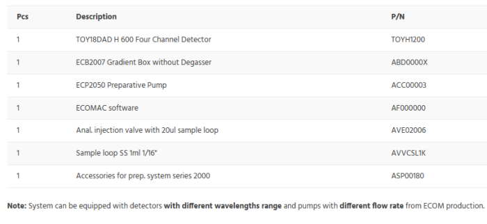 High effective preparative system containing UV DAD detector, preparative pump and box for bottles. Detector allows measuring at four wavelengths in the same time or an informative scan.