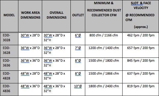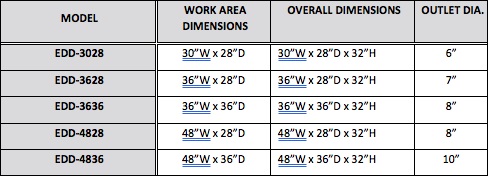 Heavy Duty. No Frills. The modular design allows for multiple tables to be bolted together to accommodate larger parts or to create work cells. Hinged deflector walls are also available in 10” or 18” high. Our heavy duty fiberglass grates reduces part scratching. Downdraft workbenches or tables minimize the migration of dust from sanding, grinding and deburring operations into the ambient space surrounding the process. The versatile design of the downdraft table allows the unit to be independently attached to a wet or dry dust collector or be an attachment in a central dust collector configured system. The downdraft tables are available with open or enclosed tops and ergonomically friendly by allowing the operator to sit down while performing their work. No other manufacturer offers this versatility coupled with this many sizes.