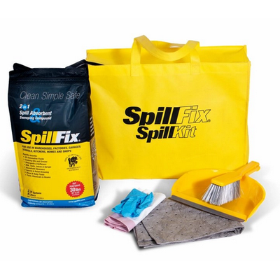 - Composition: Non-Woven Poly Bag with Handles 1 x 9qt SpillFix Resealable Pouch 2 x Medium Universal Mat Pads Dust pan & handle broom Disposable Gloves & trash bag