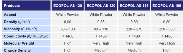 The ECOPOL AS series is polyacrylamide based solid polymers with high molecular weight and different charge densities. These anionic polyelectrolytes act as accelerators of sedimentation after previous treatment of coagulation, or as clarified agents in static settling.