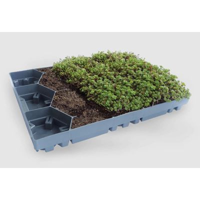 Modern roofs should be planted because a green roof brings only advantages: along with insulation against heat and cold, it also protects the building structure, traps fine dusts and stores rainwater. ECOSEDUM PACK is a pre-planted module that is delivered directly to the construction project. “Unload, lay, and you’re all set.” is our system’s motto, which is not just suited for flat roofs. This robust plastic box with an integrated rainwater retention basin ensures even growth and protection for the sedums. The selected sedum mix is your guarantee for a robust green roof with absolutely low maintenance. The immediate greening success, a great look and the fulfillment of sustainability guidelines gives this green roof system an excellent price-performance ratio.