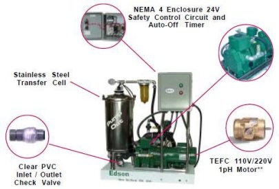 The rotary vane air pump creates a vacuum in the transfer cell. This vacuum will draw slurry into the stainless steel cell at up to 25ft. suction lift. When the tank is full it automatically pressurizes the cell discharging the slurry to drain at up to 23ft. discharge head. After the cell is discharged the cycle runs continually until manually shut off or the timed auto-off feature engages.