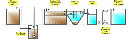 Extended Aeration Biological treatment for reduction of BOD, COD and TSS. The EFLO Constant Transfer process is conventional extended aeration treatment followed by secondary settlement, tertiary disinfection and filtration. Its most significant advantage over gravity transfer plants is that there is no direct connection between inflow and outflow. All surges of inflow, regardless of rate, can be stored in aeration tank. Sewage from aeration tank is pumped at constant rate resulting in consistent effluent quality in terms of TSS and BOD content.