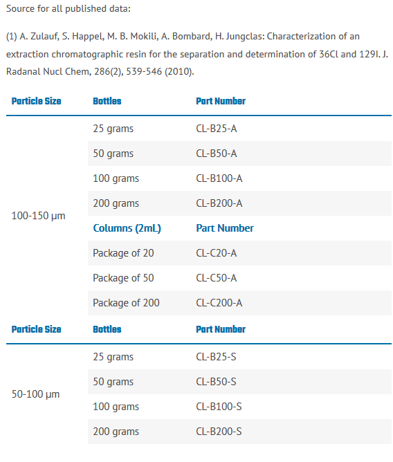 CL Resin is manufactured in two particle sizes (50-100μm, and 100-150μm) and is sold in bottles or ready to use in prepackaged columns (for gravity flow).