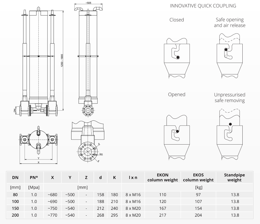 - Column types: EKON (aeration and air release), EKOS (drain-flushing).