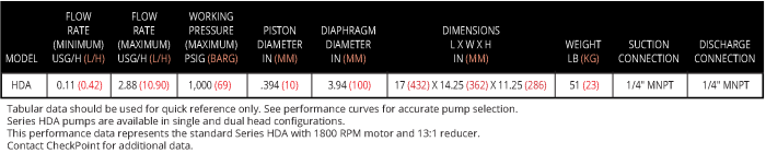 The Series HDA pump delivers up to 2.88 USG/H (10.90 L/H) and can reliably inject into pressures up to 1,000 PSIG (69 BARG). CheckPoint’s expertly designed diaphragm pump maintains its durability, versatility, and unparalleled chemical resistance due to its metallic sandwich design and the essential integration of high-quality, proprietary seal materials. In order to meet a wide variety of chemical compatibility needs and applications, wetted parts are available in 316 SS, and seals are available in Viton, HNBR, FKM, and FFKM. All wet end construction materials meet the requirements of NACE MRO175 and ISO 15156.