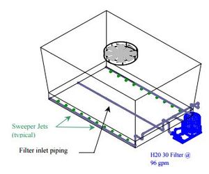 For effective solids sweeping to the filter inlet piping, typically allow one gallon per minute of flow to the sweeper jets for every one square foot of cooling tower basin area. Sweeper jet spacing is typically 8 to 10 inches.