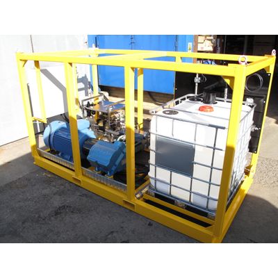 This electric skid is fitted with our three cylinder positive displacement plunger pump or Harben Century designed to give constant flows at powers up to 225kW, with operating pressures from 140 to 2500 bar. This unit can be mounted on a simple base plate or within a crash frame.  Both skid types come with forklift pockets, whilst the crash frame version also has four point lifting eyes.