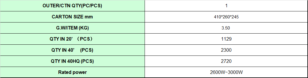 Rated power:2600W-3000W. No-load variable speed:9000-15000rpm. Vacuum volume:10.7m3. Debris reduction:10:1. Collection bag capacity:40L. Blow speed:250km/h.