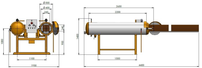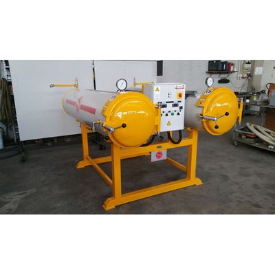 The complete vaporization equipment is composed by 2 autoclaves made in stainless steel AISI 304 with 400mm diameter with a welded bottom, cover provided with hinge opening, closure with screw hand-wheel.