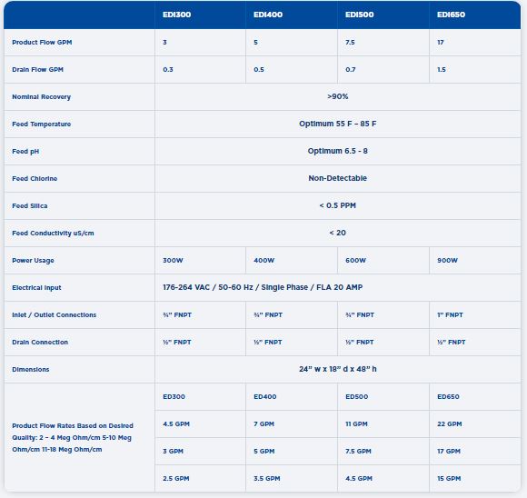 Make high-quality, deionized water with no downtime. Since our system has no chemicals required, low energy consumption and no resin disposal, our electro deionizer solutions are ethical for the environment. And because there’s no more waiting on DI tanks to be delivered and no service or monthly rental fee, you’ll have major cost savings as compared to the deionizer exchange tanks. You won’t even have to worry about rust thanks to the aluminum powder coater frame.