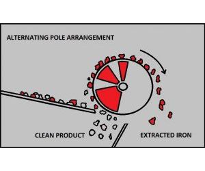 The magnetic field alternates to ‘flip’ the magnetic material as it travels around the drum. This removes stray non-magnetic particles from the product stream producing a cleaner magnetic product.