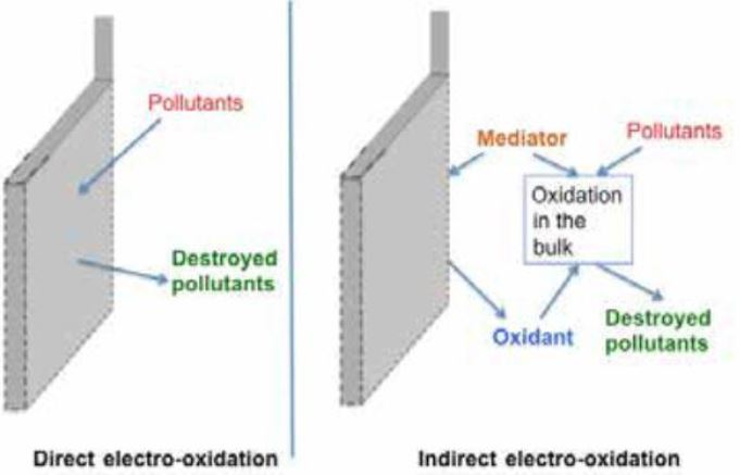 If we want to summarize the effects of direct and indirect electrochemical oxidation we can see from the diagram that the first occurs directly on the surface of the electrode and the second occurs through the formation in the solution in electrolysis of an intermediate compound (Mediator).