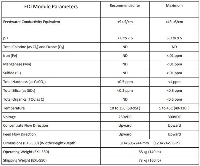 ELECTROPURE™ EXL-550 modules have next-generation innovative technology inside. The 550 series is desianed to handle higher FCE, Feed Conductivity Equivalent. This means that the EXL-550 will perform well at higher TDS (and co?). As always, EXL includes Electropure`s patented Excellion™ membranes, "never-leak" permanent 0-ring seals, unique non-scaling electrode system, efficient thin-cell technology, and connections using +GF+ unions.