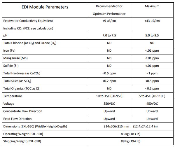 ELECTROPURE EXL-650 modules have next-generation innovative technology inside. The 650 series is designed to handle higher FCE, Feed Conductivity Equivalent. This means that the EXL-650 will perform very well at higher TDS and higher co2 and Si02 loading. As always EXL includes Electropure`s patented Excellion membranes, "never-leak" permanent O-ring seals, unique non-scaling electrode system, efficient thin-cell technology, and connections using +GF+ unions.