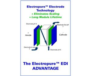 Electropure EDI uses a proprietary design which keeps the electrodes always on the acidic side, preventing scaling in the electrodes. It also uses a special anode technology to limit the production of chlorine, which lengthens the life of the EDI module.