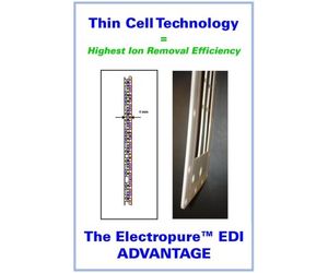 Electropure EDI has always had the advantage of thin cells. In EDI, there is a physical competition to drive ions horizontally out of the cell before they leave the top of the cell. Electropure XL cells are 4mm wide, as compared to Ionpure and E-Cell which have cells about 10mm wide. This allows higher quality and higher efficiency.