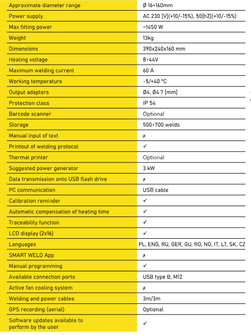 The device handless fittings used in the plumbing and gas industry. It allows four programming modes, manual, scanner, barcode manual, as last. It is permanently mounted in a metal transport box, which convenient transportation of the device. Simple and transparent operation of the sealing machine control program. Barcode scanner and GPS aerial can be connected (optional accessory).Trans former temperature measurement system for protection against overheating. Printout of the welding protocols on a thermal printer or from a PC by means of free software downloadable from the manufacturer`s website.