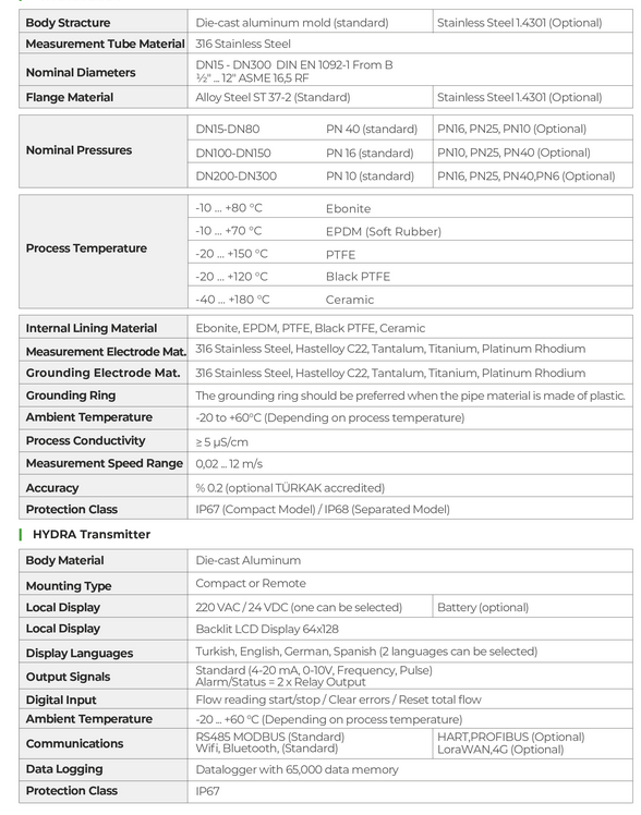 Since there are no moving parts in the HYDRA Series electromagnetic flowmeter, it does not cause any changes in process pressure, and maintenance costs are very low. Additionally, thanks to this feature, it provides "full passage" and has a very wide measurement range.HYDRA Series electromagnetic flowmeters can be easily used for volumetric flow measurements of water and wastewater applications, as well as any water-based or conductive liquids. In addition, with a wide range of internal coating and electrode material options, they offer relia- ble solutions for volumetric flow measurement of acids, alkalis, and corrosive chemicals used in the industry. Furthermore, electromagnetic flowmeters are widely used in the mining and paper industries for volumetric flow measurements of special products like ores, sludges, slurries, pastes, and pulps.