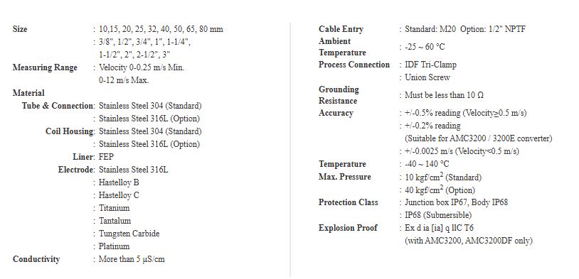 The AMF601 Series is a sanitary-type electromagnetic flowmeter ideal for conductive liquids. It comes in sizes from 10-80 mm. The AMF601 is widely used for drink water, milk, food & beverage juice and many other industrial fluids. AMF601 Series electromagnetic flowmeter can be used in compact or remote model with AMC Series converter of electromagnetic flowmeter.