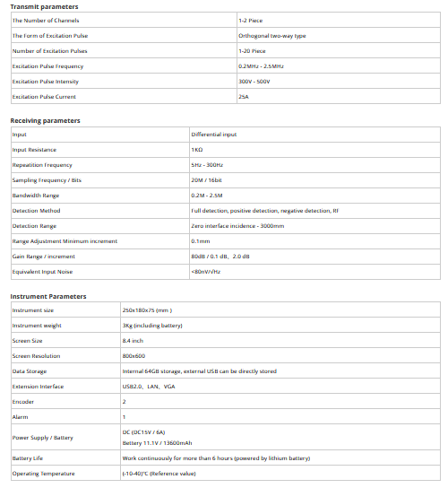 - Suitable for corrosion detection, internal and external injury detection of various plates, bars, pipes and metal containers, and accurate thickness measurement at high and low temperatures