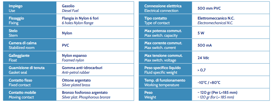 Use: Diesel fuel. Fixing: 6 holes nylon flange. Output signals: ELECTROMECHANICAL N.C.