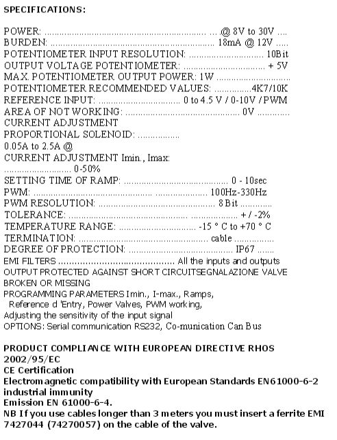 The command REP-100 is born for controlling proportional valves with one solenoid valves open loop ie those that do not have internal positioning of  the transducer. The REP100 device is a  microcontroller that thanks to this technology,  `DIGITAL`, you can drive any type and brand of proportional valve, a voltage between 10 and 30 Vdc and a current between 0 and 2500mA. Adjustment of the current and ramps is done via a PC or handheld programmer software  GAMMA1.32 SUITE PES93C46. The controller is integrated into a completely sealed metal box with IP67 protection.