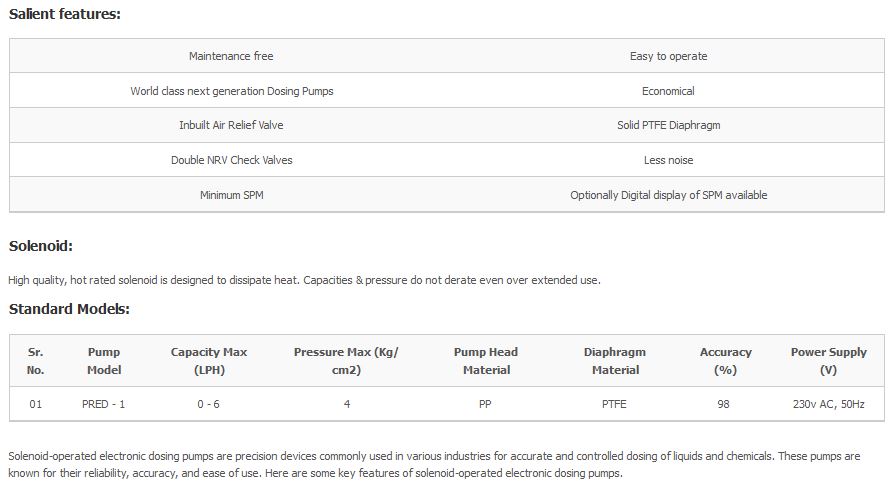 It is a positive displacement diaphragm metering pump operating at 230V, 50Hz supply. It is base mountable. Solenoid pushes the diaphragm which in turn pushes the liquid into the system. Solenoid is actuated by a solid-state electronic circuit. It has controls for the desire accuracy of the dosing.