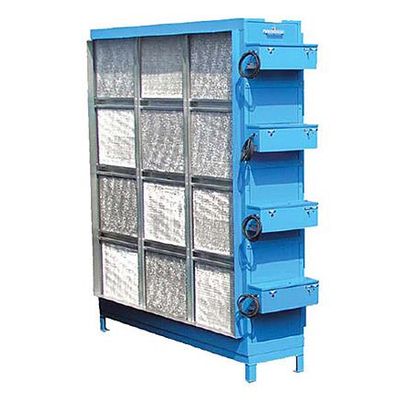 As contaminated exhaust enters the unit, it passes through an ionizing section where each particle is given a negative charge. The negatively charged particles then flow into a collecting cell which contains a series of parallel metal plates that are alternately charged on a positive and negative basis. As the exhaust passes between the plates, the negatively charged particles are repelled by the negatively charged plate and are attracted towards, and held by, the positively charged collection plates. The cleaned exhaust then passes to atmosphere or back into the facility.
