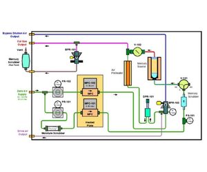 A Peltier heater/cooler maintains a precise temperature for the mercury reservoir. A mass flow controller (MFC101) provides a precise and accurate carrier flow through the mercury chamber. The emerging air is saturated with elemental mercury vapor. This saturated flow is diluted with MFC-102. Solenoid valves serve to positively isolate the source when mercury is not required and to select between two available outputs. Backpressure regulators provide positive pressure relief in case either output is activated while blocked. The MFC’s are heated to minimize thermal drift. Additional heated zones and safety interlocks ensure that the source is activated only when all temperatures are stable.