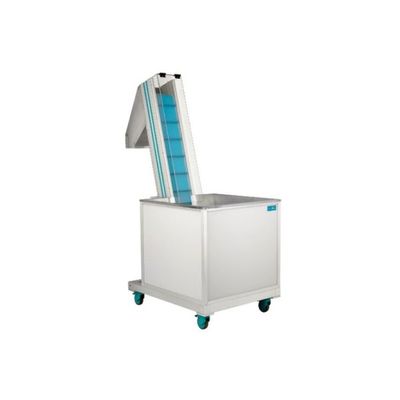 Anodized ALU profile structure (thickness 15 Microns) Alloy 6060. Standard configuration complete with: Polycarbonate tunnel to protect the elevator lane. Elevator hopper with external structure in aluminium profiles, painted sheet metal sides and internal panels in AISI 304 2 mm thick stainless steel sheet. Elevator unloading chute in aluminium complete with internal lining applied to the surface in contact with the product. Padlockable switch/motor protector + cable and plug. Standard cut-proof, oil-proof belt with smooth green Polyurethane covering (ref. Pantone 320) and h 30 mm heat-welded slats at 150 mm pitch; vulcanized belt joint. Temperature resistance: from -10 to +90°C.