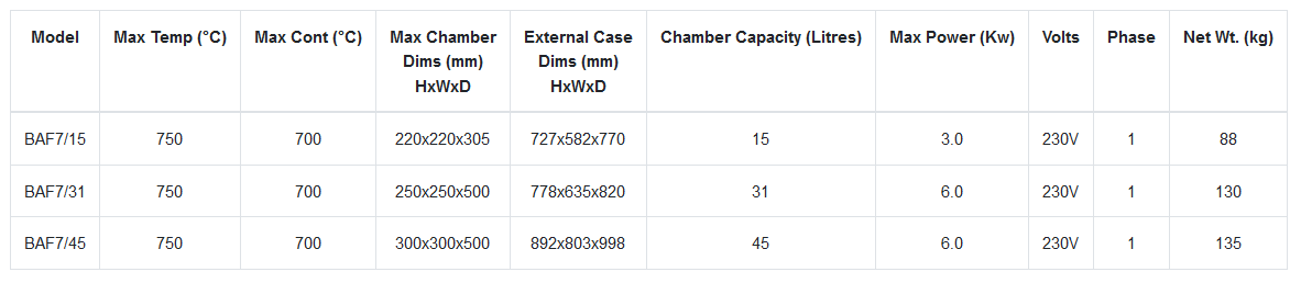The BAF 7 air re-circulating furnaces provide good temperature uniformity and rapid thermal transfer to the load at lower temperatures, suitable for low temperature applications such as annealing, stress relieving, tempering and normalising and offers a choice of chamber capacities ranging from 15 to 45 litre. Applications include annealing, stress relieving, tempering and normalising.