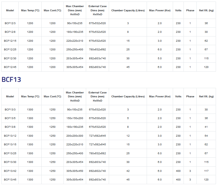 BCF12 and BCF13 General purpose chamber furnace is designed for General purpose laboratory applications and providing satisfactory performance for many firing applications and is available in various capacities ranging from 3 litres to 45 litres.