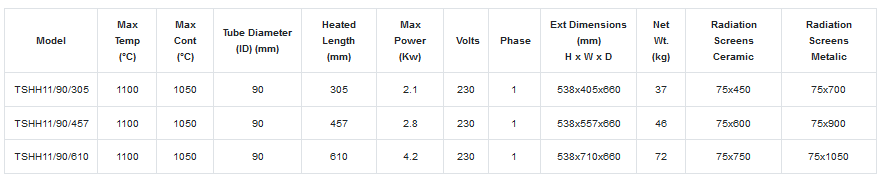 - The furnace accepts a range of work tubes up to 90mm outside diameter when used with tube reducer inserts.