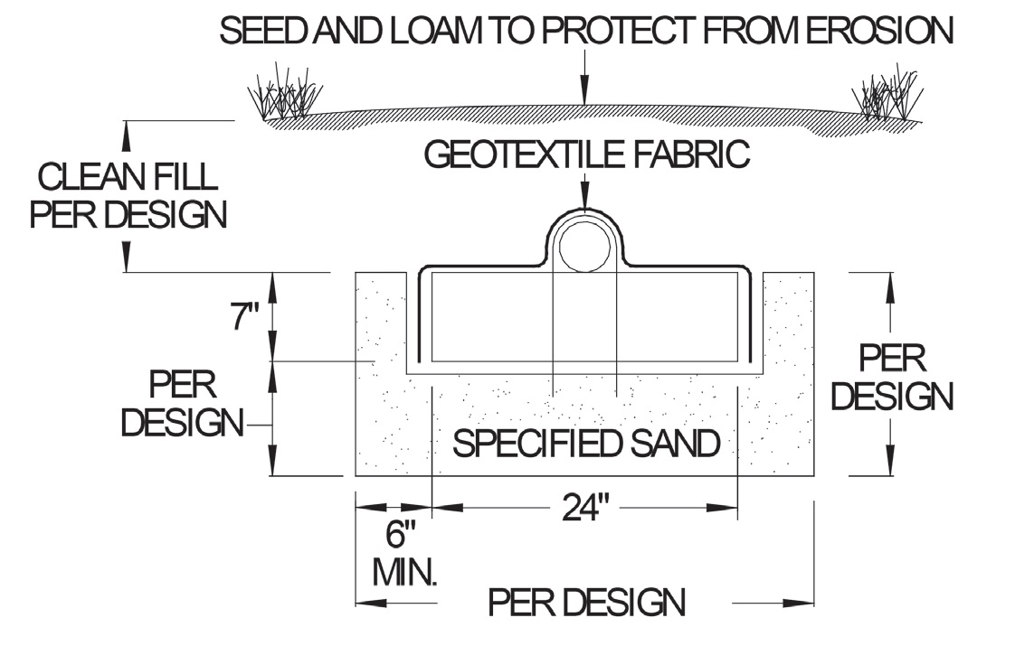 Installation shall comply with the latest installation instructions published by Eljen Corporation and abide by local regulations. Eljen Modules are installed along their 4-foot lengths on a base of stabilized Specified Sand, with the painted stripe facing up. A 4? perforated pipe is centered on top of the Modules, and is secured with supplied metal clamps (one per Module). Cover fabric is supplied by Eljen and substitutions are not allowed.  Specified Sand is placed along both sides of the Module, and at the beginning and end of each row once the cover fabric is in place. For more specifications and detailed installation instructions consult the appropriate Design and Installation Manual.