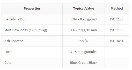 Recycled High Density Polyethylene. Applications: Extrusion, blow molding.