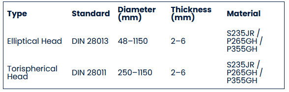 - Available Types: Elliptical End Caps, Torispherical Heads, Dished Tank Ends
