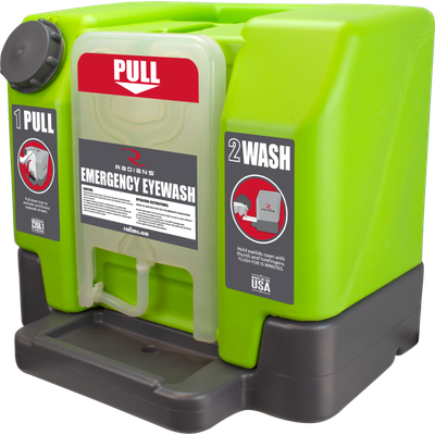 To effectively and quickly clean debris from the eye, the Radians® 12 gallon REW01112 gravity-fed, portable Eyewash Station has a one second, one-step activation to deliver up to 15 minutes of non-injurious flow for compliance with ANSI Z358.1 standard. Its manifold features MIN and MAX lines to ensure proper fill level and is designed to collect and divert wastewater to a container beneath.