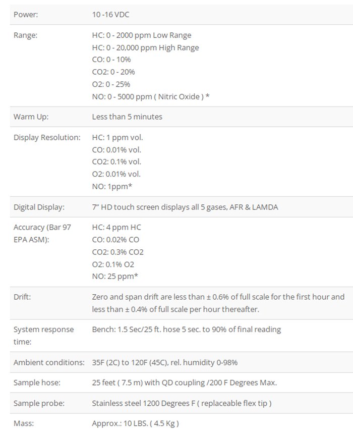 It is designed to meet BAR 97 ( EPA ASM ) and OIML R99 Class 0 standards. The 5003 model uses all updated electronics and a 7” HD touch screen display. The unit is compact featuring robust metal housing designed to withstand the most difficult shop or mobile environments. The unit can be shipped as a four or five gas analyzer.