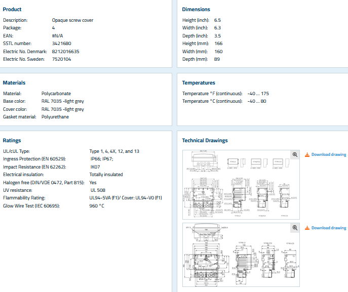 - Ratings: UL Type Type 1, 4, 4X, 12, and 13: IP66; IP67;; IK07