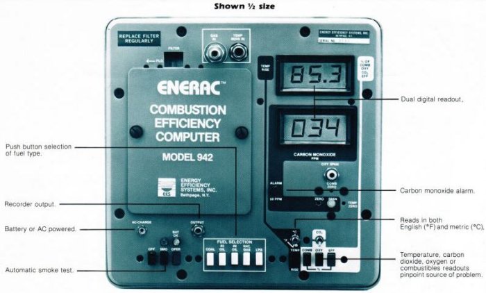 ENERAC is a compact, battery operated, combustion efficiency computer that offers continuous digital readouts of the following: