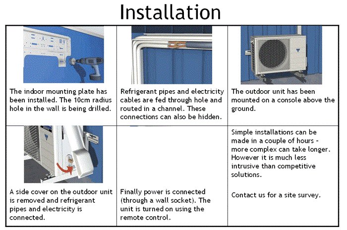 These connections are made through a 50mm/2" hole in a wall that is drilled during installation. The maximum distance between the indoor and outdoor units is dependant on the model selected and range from 15 to 50 metres.