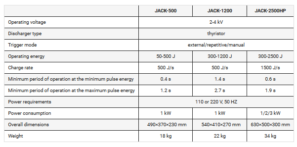 In Jack-500 and Jack-1200 models, pulse chargers provide a charge rate 500 J/s. More powerful versions are equipped with even faster chargers with a rate up to 3000 J/s and adjustable maximum power consumption. Thus, all energy sources Jack can work with compact portable 110 / 220 V generators (with power from 1 kW). Jack’s design deploys a reliable thyristor key, that enables obtaining a really short high-voltage electric pulse.